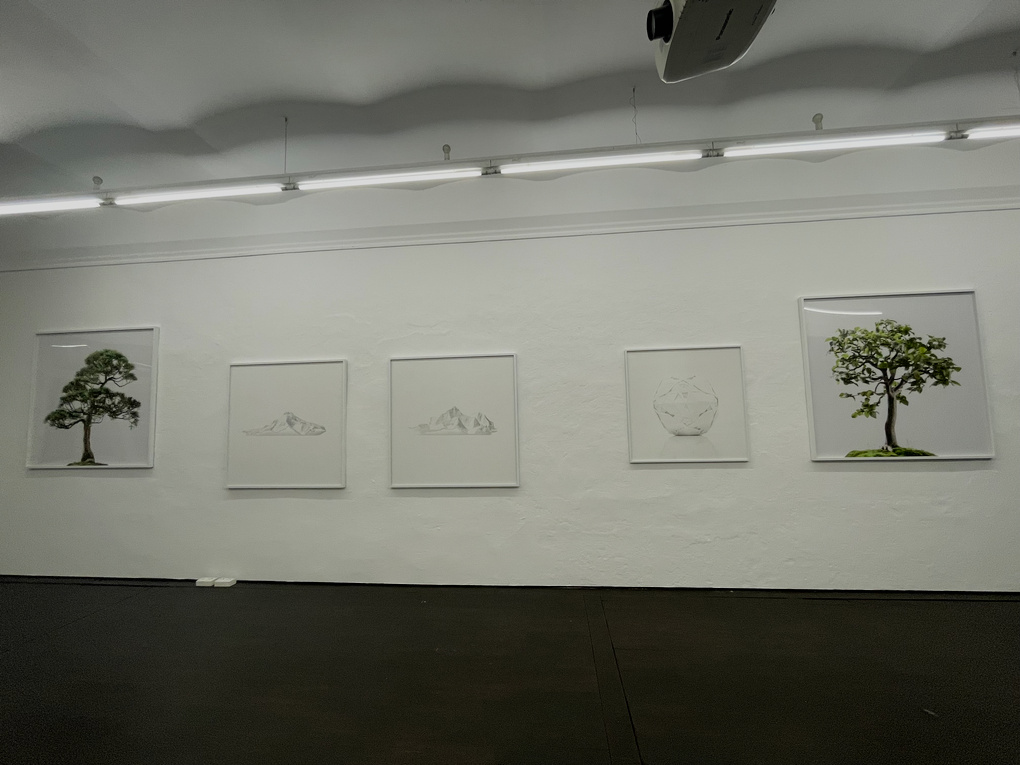 Die sechs Bilder an der Wand sind Schlaglichter aus seinem aktuellen Buch. Zwei Bäume (Bonsai), drei Bergreliefe (3D-Drucke der höchsten Gipfel) und zwei Origami-Skulpturen (gefaltet aus den Papierresten des weißen Studiohintergrunds). Alle Objekte werden vor einer weißen Hohlkehle fotografiert und neutral ausgeleuchtet. Das Ziel: Der Größenbezug soll verloren gehen. Durch die überdimensionalen Ausmaße der Fotos (gefühlt: 2 m mal 2 m) wirken die Objekte seltsam versetzt. David Steinbacher kommt aus der Werbefotografie und weiß genau, wie er mit der Lichtsetzung und seiner Kameraposition umzugehen hat, um eine bestimmten Effekt zu erreichen. (Anmerkung: Ich hätte mir mehr Tiefenschärfe bei den Bäumen gewünscht.)